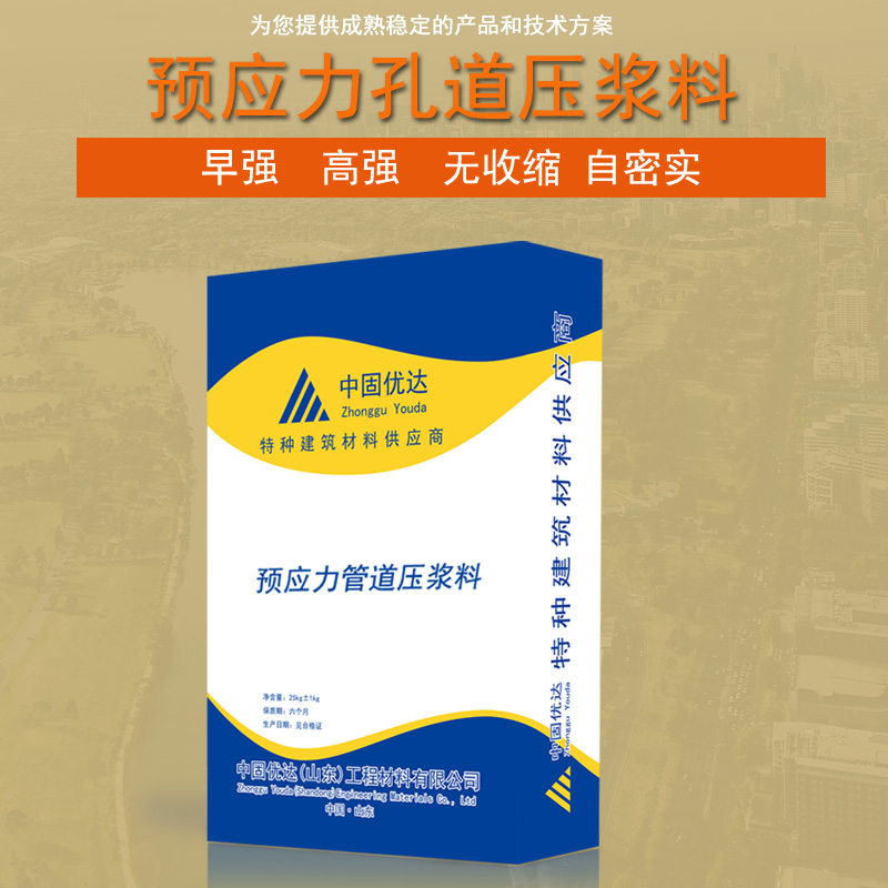 預應力管道壓漿料簡稱壓漿料,是由優(yōu)質(zhì)水泥基材料、減水劑、微膨脹劑、礦物摻合料配制而成,具有良好的流動性,不泌水,不離析,無收縮、微膨脹,強度高,抗?jié)B抗凍、抗腐蝕、粘接度高、綠色環(huán)保等特點,不含氧化物、氯化物、亞硫酸鹽和亞硝酸鹽等對鋼筋有害組份,產(chǎn)品廣泛應用于鐵路橋梁、公路橋梁、核電站等大型工程的預應力結(jié)構(gòu)孔道灌漿的施工;各種砼結(jié)構(gòu)接頭處止漏灌漿;空隙填補或修復;地面錨固壓漿、設備基礎壓漿、底板注漿、梁柱節(jié)點、工程搶修等用途。
